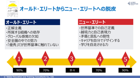 研究会では、「自社でのオールド・エリートとニュー・エリートの割合」をディスカッションいただく場面も。ご参加者からは、「(自社の多数が)オールド・エリートである、という事を認識してなかったので、衝撃でした。その現状を直視することなく研修の構築をしたら、間違ったメッセージを送ってしまうところでした」という強い気づきのコメントもいただきました。